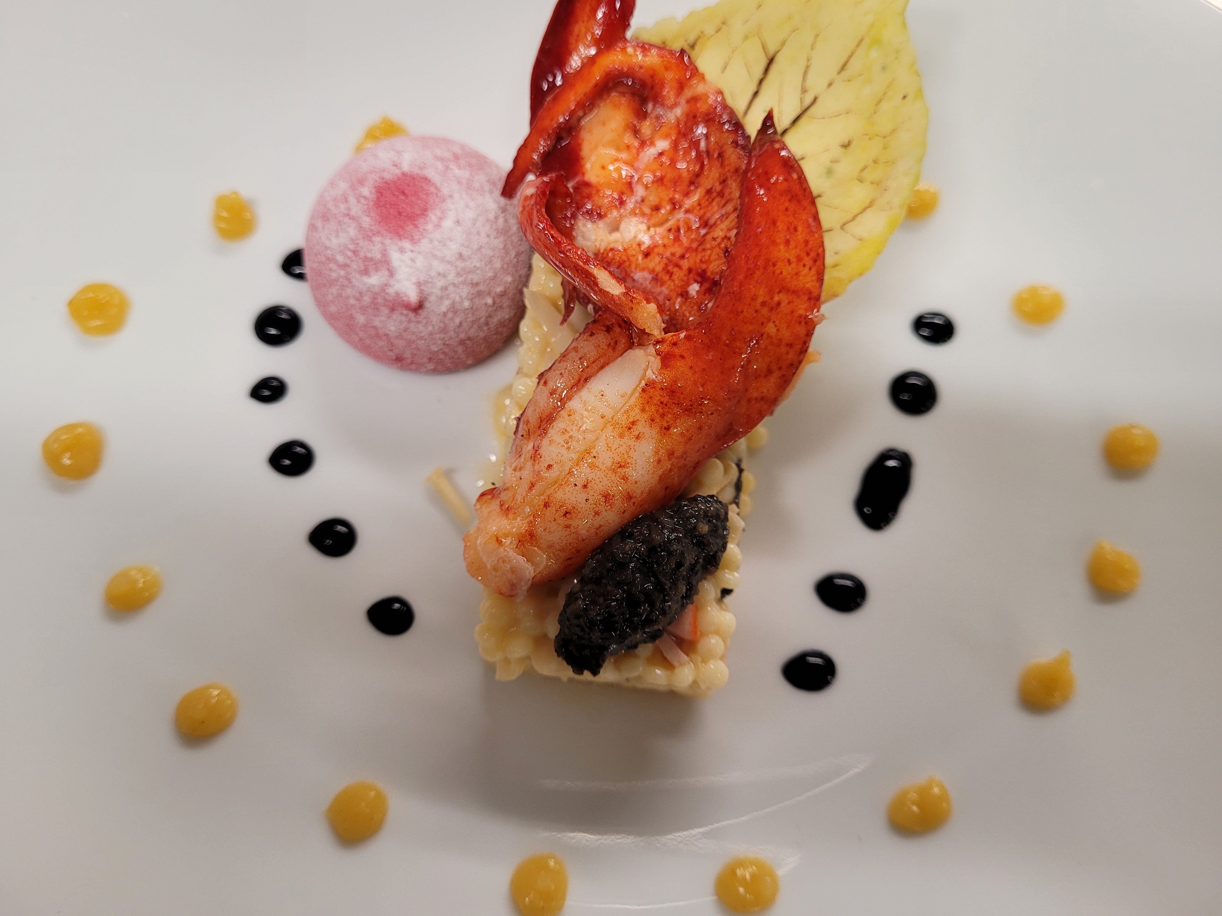 Émincé de homard sur lit de pâte perlée-tapioca-quinoa-saumon fumé,